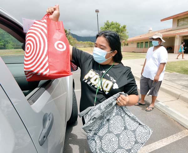 - Pomaikai Elementary School educational assistant Hollie Batulayan accepts a pair of bags of school supplies from a parent Thursday afternoon as fellow educational assistant Abe Hernandez looks on. — The Maui News / MATTHEW THAYER photo